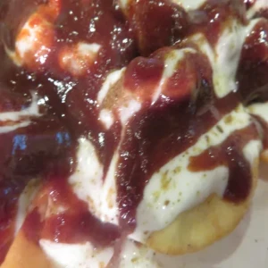 Vegetarian Gluten Free Vegan Halal Kosher Allergy Friendly Not ApplicableFive crispy golf - size hollow balls filled with luxurious layers of yoghurt, green chutney, tamarind sauce,gram peas, chopped patatoes, topped with creamy yoghurt. Garnished with chaat masala, tamarind sauce and sev.