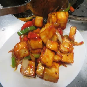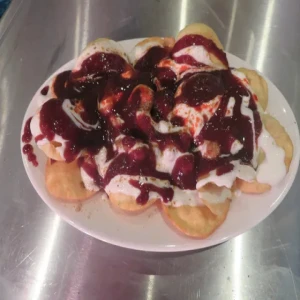 Vegetarian Gluten Free Vegan Halal Kosher Allergy Friendly Not ApplicableA spicy indian patato cake flavoured with dry roasted cummin seeds,topped with a chickpea curry.Garnished with sweet chilli, tamarind and yoghurt sauces, and freshly chopped red onions and corriander.