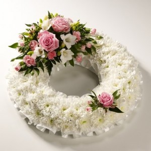 MOM TRIBUTE ALSO AVAILABLE. Please call to order. A mass of white Double Spray Chrysanthemums is finished with delicate flower sprays of Roses and Alstroemeria in soft pinks to create this Mum Tribute
